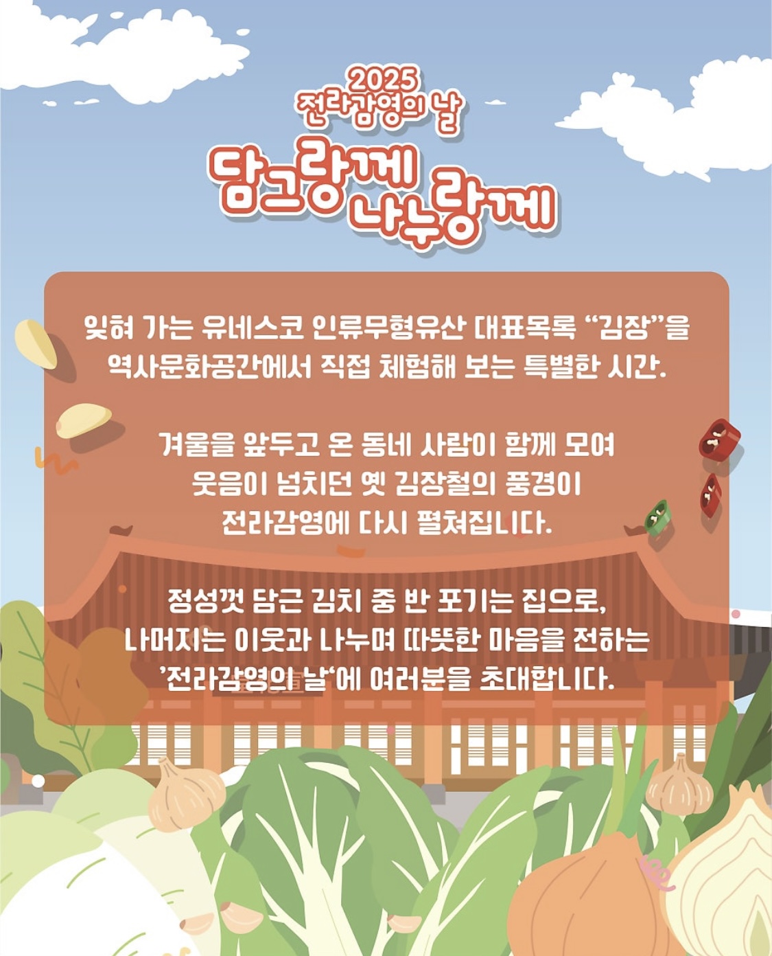 전북 전주시가 오는 11월 30일, 전라감영 서편 부지에서 ‘2025 전라감영의 날’ 기념행사로 김장 체험과 기부 행사를 결합한 ‘담그랑께 나누랑께’를 진행합니다.🥰
