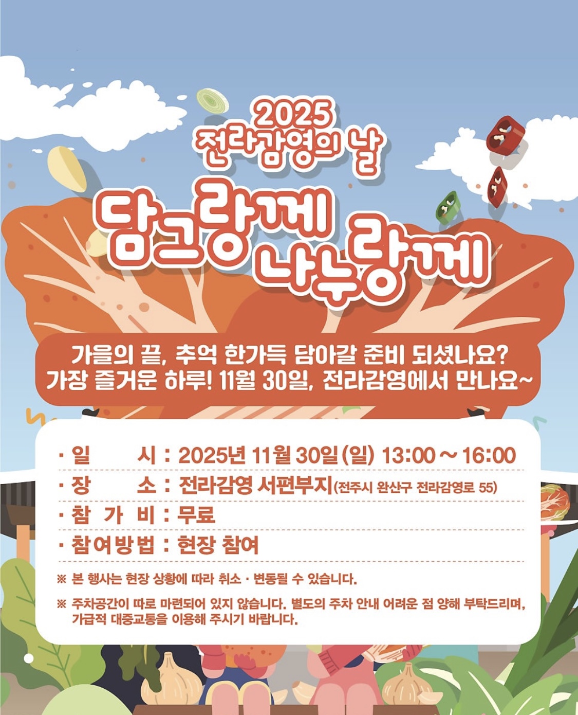 전북 전주시가 오는 11월 30일, 전라감영 서편 부지에서 ‘2025 전라감영의 날’ 기념행사로 김장 체험과 기부 행사를 결합한 ‘담그랑께 나누랑께’를 진행합니다.🥰